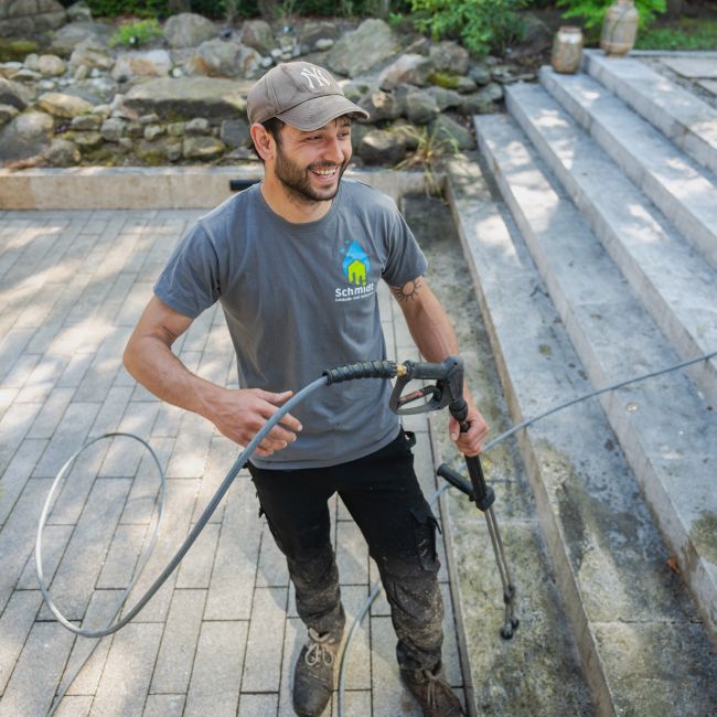 Egal ob Privathaushalt, Unternehmen oder Wohnanlage – wir kümmern uns zuverlässig um Ihre Immobilie: Von der Dach-, Hof- und Fassadenreinigung, über die Büro- und Treppenhausreinigung, bis hin zur professionellen Anlagenpflege, Garten- und Landschaftspflege sowie einem verlässlichen Winterdienst. Gründlich, engagiert und stets mit Blick für das Ganze – Schmidt steht für gepflegte Immobilien, innen wie außen.